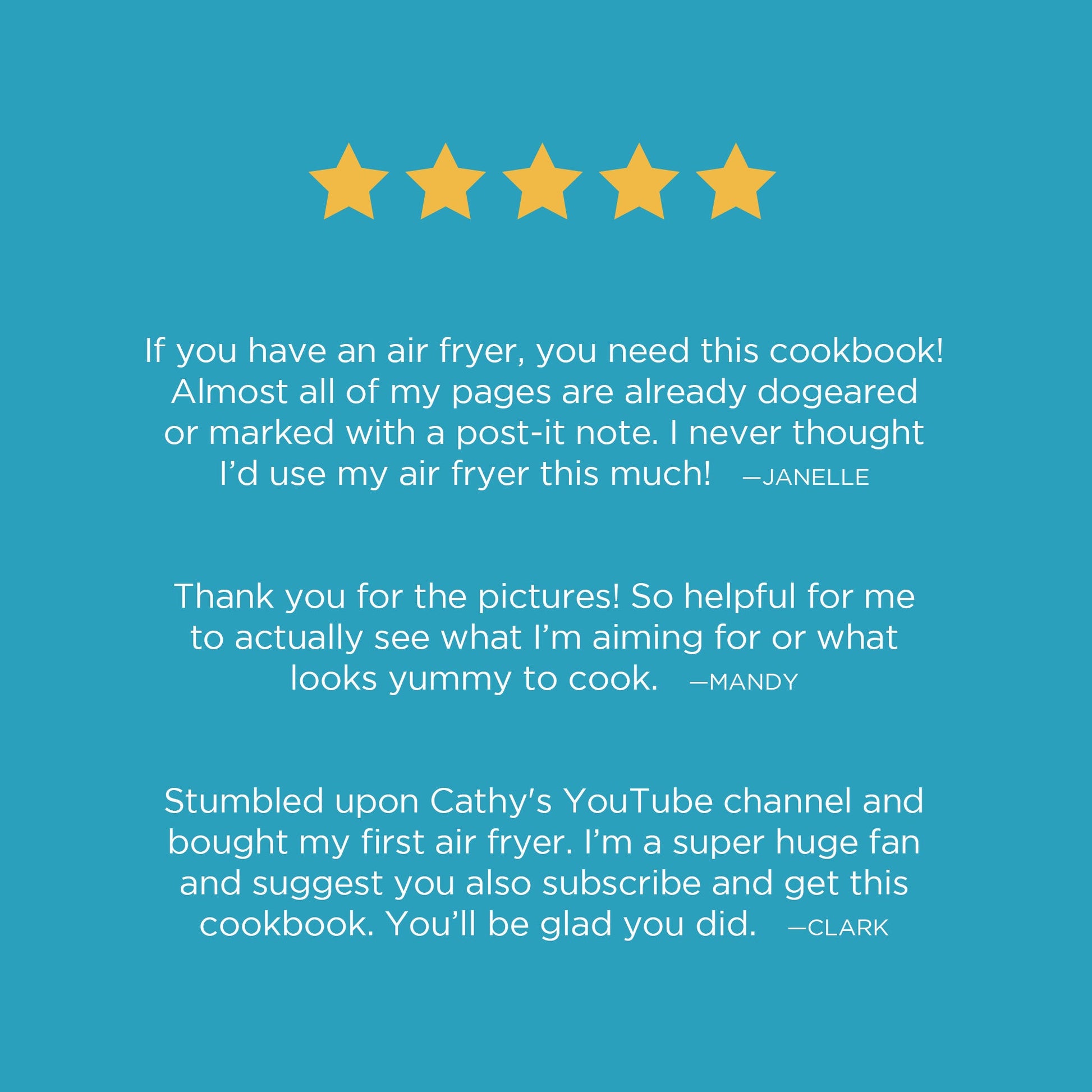 I bought this to support Cathy. Pictures of finished recipe are very nice and a must for a good cookbook. I took off 2 stars because she doesn't indicate in her recipe which setting to use. She just indicates to cook at whatever temp and for how long. I bought a Cosori Air Fryer based on her recommendation. You think maybe you could have just indicated what setting you used to create the dish???? After all your purpose was to teach us how to use our air fryer.