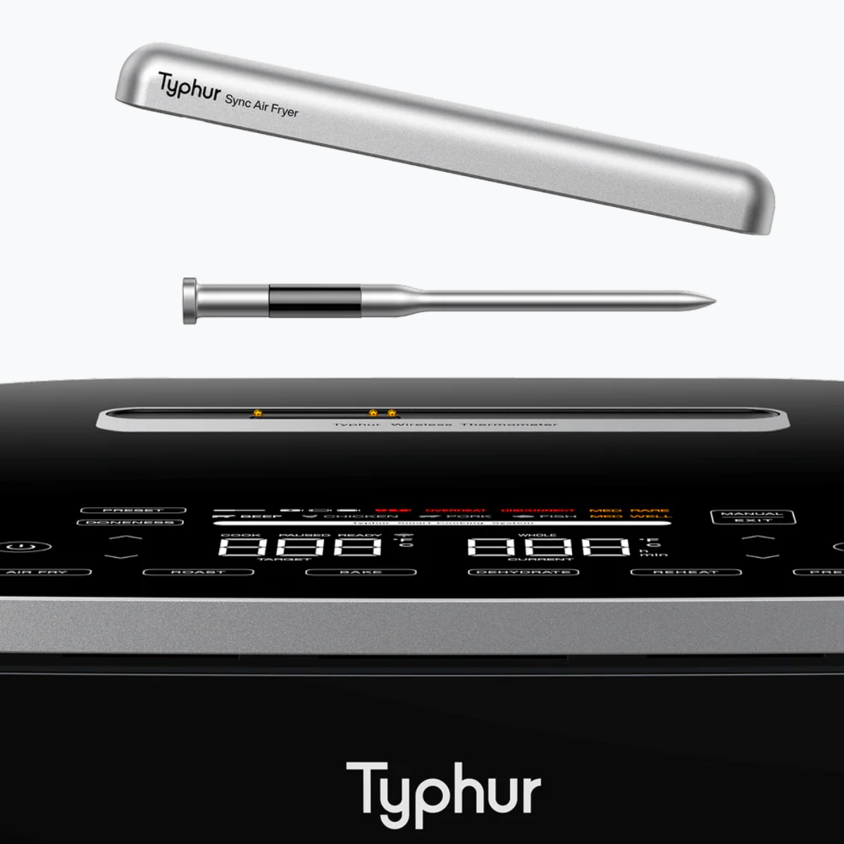 "Yes! I'm getting excited about the world’s first air fryer with a built-in wireless thermometer!" The technology of the new Typhur Sync air fryer means food stops cooking automatically when done! Plus the basket is 10.3" x 10.3" x 4.75" and PFAS free ceramic coated (not coated with teflon).